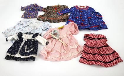 6 bunte Sommerkleider und 1 Fleece-Bademantel für mittelgroße Puppen. Auch für Käthe-Kruse-Puppen geeignet