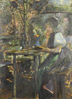BAUER, Leo (1872 Münstertal/Baden - 1960 Stuttgart): Junge Frau beim Lesen im Garten.