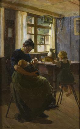 Stillende Mutter in der Stube neben dem Tisch und dem Geschwisterchen am Fenster