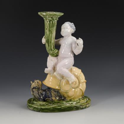 Auf einer Schnecke sitzender Putto mit einem Füllhorn als 1-flammigen Leuchter, auf ovalem Sockel