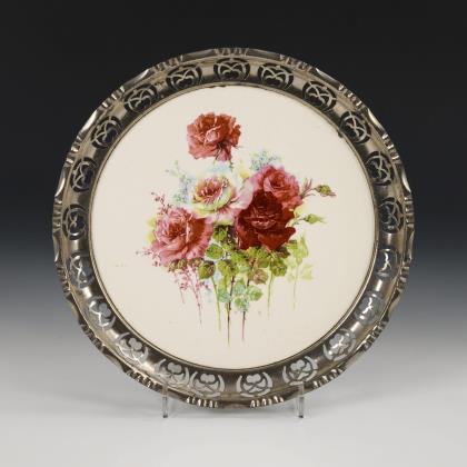 Jugendstil-Kuchenplatte mit Rosendekor und Metallmontierung. Bayrische Metallwarenfabrik GmbH Nürnberg.
