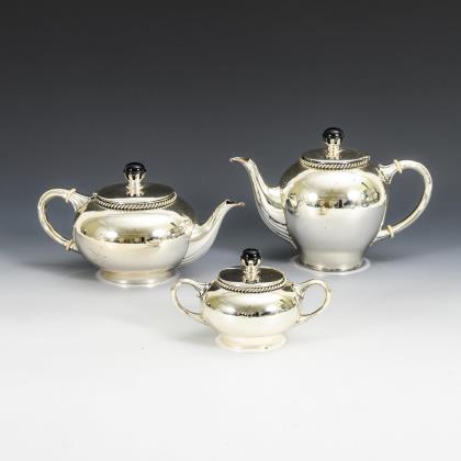 Kaffeekanne (H 17,5 cm), Teekanne (H 13,5 cm), Zuckerdose mit 2 Henkeln (H 10,5 cm). Jeweils eine glatte bauchige Wandung mit Kordelrand und flachem Deckel mit schwarzem Knauf aus Bakelit