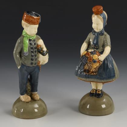 Stehender Knabe mit Gans, Trachtenmädchen mit Blumenkorb, jeweils auf gewölbtem Sockel