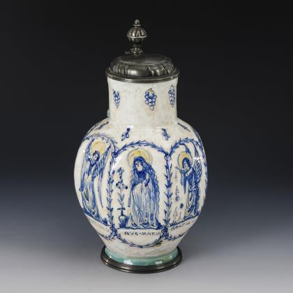 Kugelbauchkanne mit Zylinderhals und 7-fach geplatteter Wandung, 2-strängiger Bandhenkel mit teilplastischen Manschettenbändern, abgesetzter Stand. Umlaufend Kranznischen mit Heiligenfiguren und Engeln, alternierend bezeichnet "Ave Maria" und "Gratia". Godronierter Zinndeckel mit Kugeldrücker, Zinnstandring