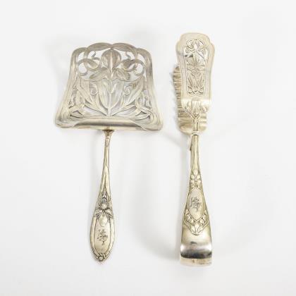 3 Jugendstil- und Art-déco-Objekte: Schlanke balusterförmige Vase mit gerippter Wandung, am Stand graviert "Kurt 31.3.12", 800/Firmenzeichen Gebrüder Kühn/Halbmond/Krone gepunzt (H 27,5 cm). / Kelchbecher mit Widmungsgravur von 1907, 800/Halbmond/Krone/Jacob Leser gepunzt (H 18 cm). / 2-flammiger Art-déco-Kerzenleuchter, Halbmond/Krone/835/Firmenzeichen Jakob Grimminger gepunzt (H 15 cm)