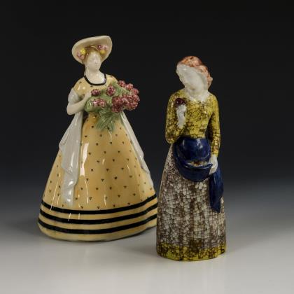 Elegante Dame mit Schutenhut, weitem Kleid und großem Blumenstrauß, Modell-Nr. 894 F3 14, H 25 cm. Art-déco-Dame mit blauer Schürze und Blume, Modell-Nr. 5255, H 24 cm