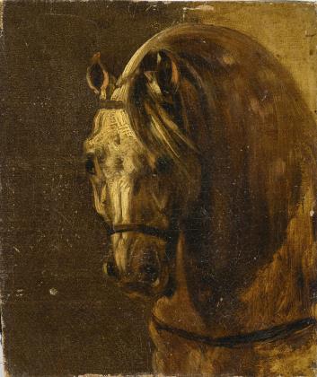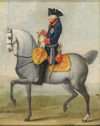 Der preußische König auf grauem Schimmel in flacher Landschaft