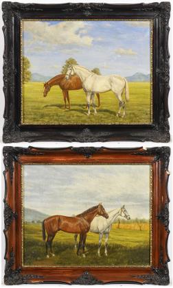 Jeweils Darstellung von zwei Pferden auf einer Wiese an einem sonnigen Tag