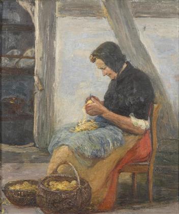 Genreszene mit älterer Frau beim Schälen der Kartoffeln am Haus