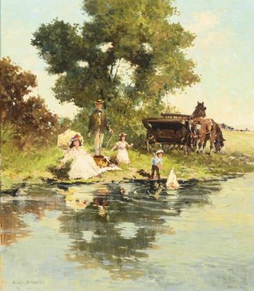 Eltern und Kinder in der Mode um 1900 mit einer Kutsche am See im Sonnenschein