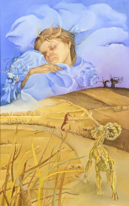 Surrealistische Traumlandschaft mit Seepferdchen und laufender Kornhockenpuppe und schlafendem Kind im Himmel