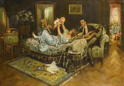 KLINGER, Max ?. Genreszene mit Malerin und Musikant.