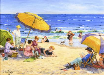 DE FLEURY, A.. Belebte Strandszene.