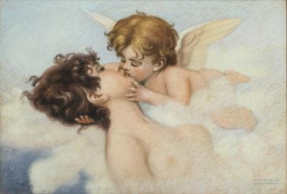 Schlafende nackte Frau in Wolken, welche vom geflügelten Amor geküsst wird