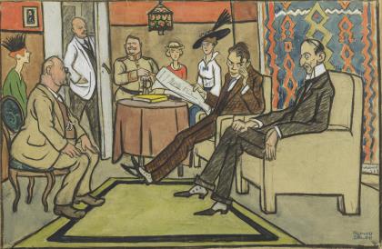 Auf den Arzt wartende Männer und Frauen in einem Salon, mit vielsagenden Blickbeziehungen