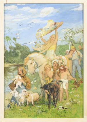Allegorie mit junger Frau auf weißem Pferd beim Verstreuen von Blüten und umgeben von Kindern, jungem Vieh und Bauern