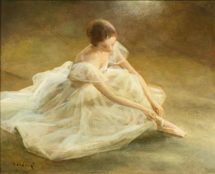 Auf dem Boden sitzende Tänzerin im weißen Kleid beim Binden der Schuhe
