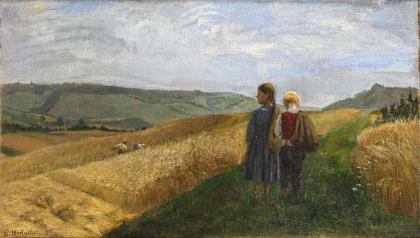 HORLACHER, Emma: Bauernszene mit Kindern am Feldrand.