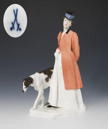 Jugendstil-Figurengruppe: Dame im Reitkostüm mit Windhund. Meissen.