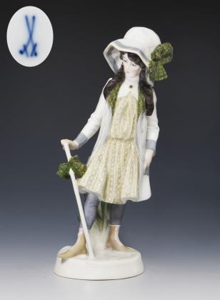 Jugendstil-Figur: Mädchen mit Gehstock und Schlapphut. Meissen.