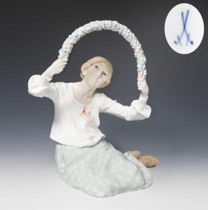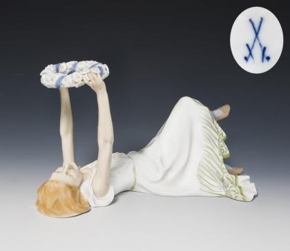 Jugendstil-Figur: Mädchen mit Blumenkranz. Meissen.