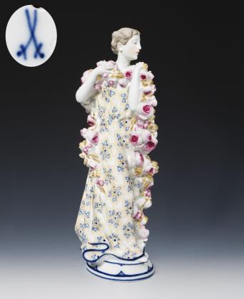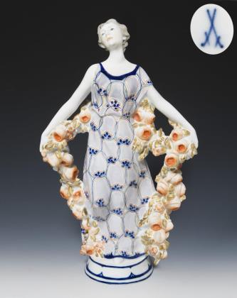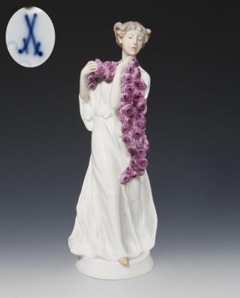Seltene große Jugendstil-Figur: Mädchen mit Rosengirlande. Meissen.