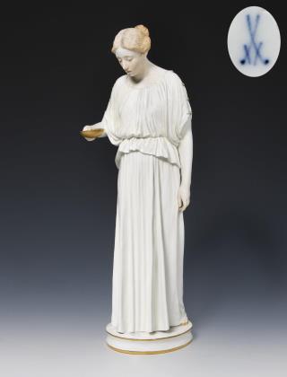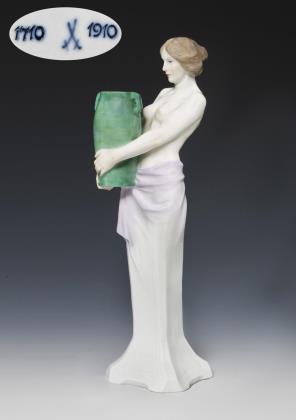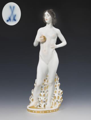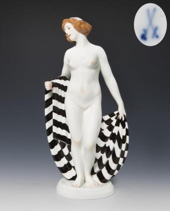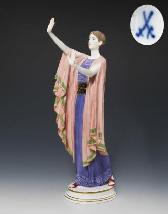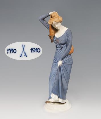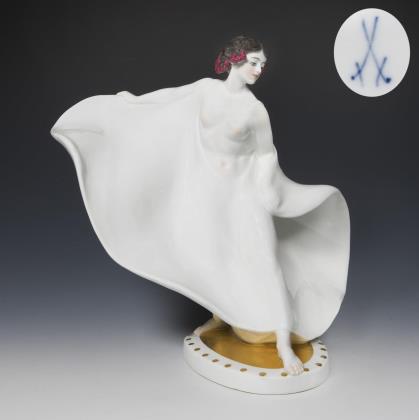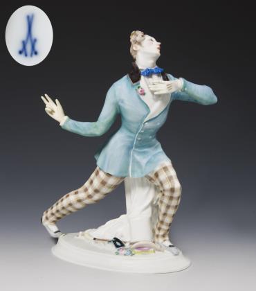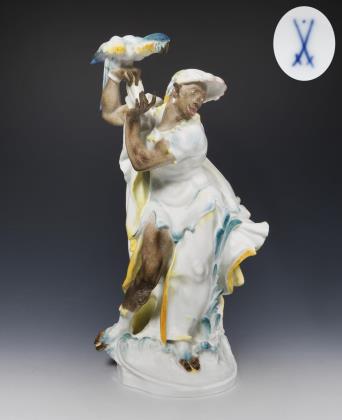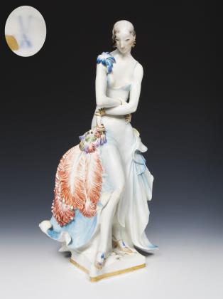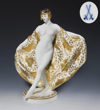 Farbig bemalt, gold staffiert. Pressmarken mit Weißzeichen, Schwertermarke am Sockel zweimal gestrichen, Künstler-Signet. DIE FIGUR WURDE AUF DER PARISER WELTAUSSTELLUNG 1937 MIT EINEM GRAND PRIX AUSGEZEICHNET