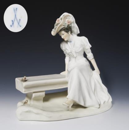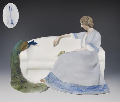 Jugendstil-Figur: Dame, einen Papagei fütternd. Meissen.