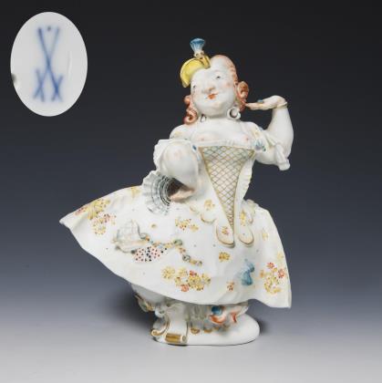 Aus einer Serie von 5 Figurenn, detailreich modelliert, farbig bemalt, gold staffiert. Er dirigiert mit geschlossenen Augen, diverse Schönheitspflästerchen (Mouche) im Gesicht. Pressmarken, Schwertermarke