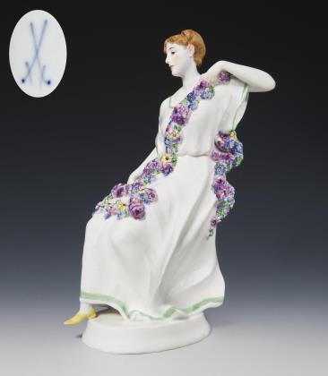 Seltene Jugendstil-Figur: Mädchen mit Blumengirlande. Meissen.
