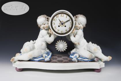 Farbig bemalt, gold staffiert. Original-Porzellan-Zifferblatt mit reliefierten arabischen Zahlen, originale Porzellan-Pendellinse. Lenzkirch-Uhrwerk mit Schlagwerk auf Glocke, Schlüsselaufzug. Montierte Kugelfüße. Ritzmarke, Pressmarke, Malermarke, Schwertermarke, Pressmarke: Von 5 Urstücken Nr. 4, handschriftliches Künstler-Signet, datiert: 1921.DAS ERSTE EXEMPLAR WURDE IM SEPTEMBER 1921 FÜR 3824,- MARK VERKAUFT. 1918 wurde die Herstellung von Urstücken (Künstler-Exemplare) eingeführt. Die Ausformung und Staffierung dieser Exemplare wurde vom Künstler selbst überwacht oder nochmals überarbeitet. Daher sind Urstücke meist vom Künstler selbst in Überglasurfarbe signiert. Brandrisse zeugen von den technischen Schwierigkeiten bei der Herstellung von Urstücken