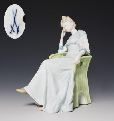 Jugendstil-Figur: Mädchen im Korbstuhl. Meissen.