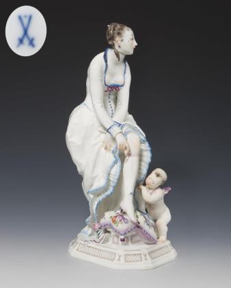 Art déco-Figur: Dame mit Strumpfband und Amorette. Meissen.