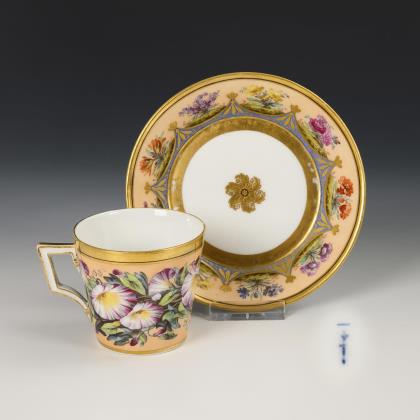 Konische Tasse mit gewinkeltem Henkel. Umlaufend auf der Tasse ein Prunkwindenband vor apricotfarbenem Fond, passend ergänzte Untertasse mit apricotfarbenem Fond und Blumenmalerei