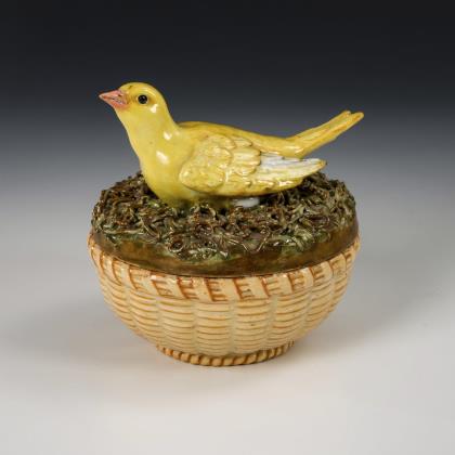 Korboptischer Korpus, in der Art eines Nestes gestalteter Deckel mit auf dem Nest sitzenden, brütenden Kanarienvogel