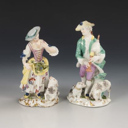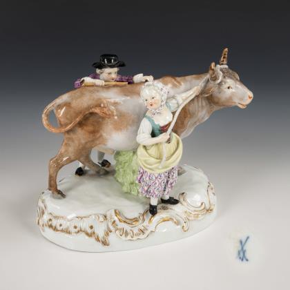 Auf einem rocaillereliefierten Sockel stehendes, einen Stier führendes Kinderpaar