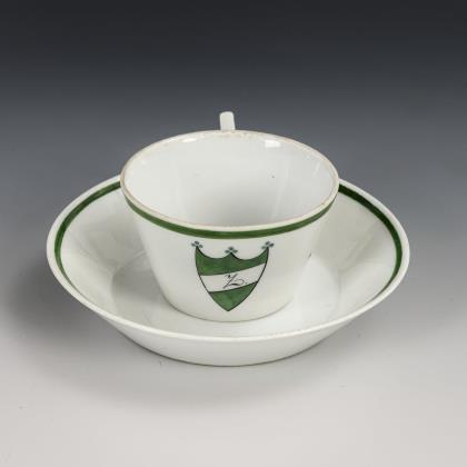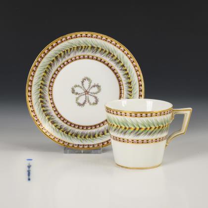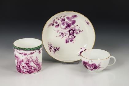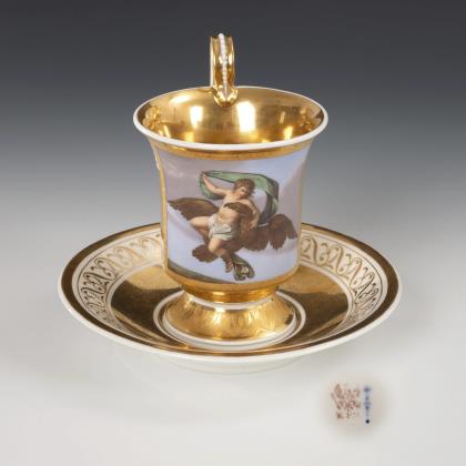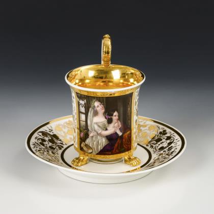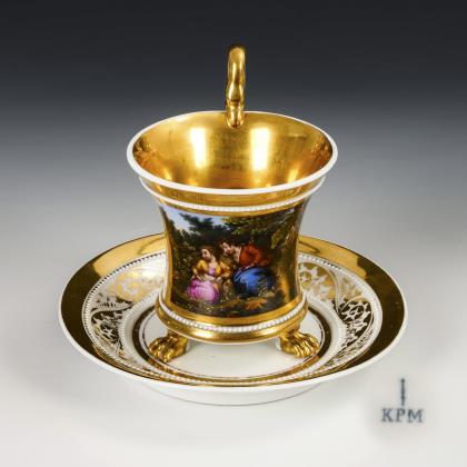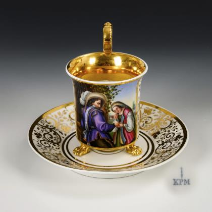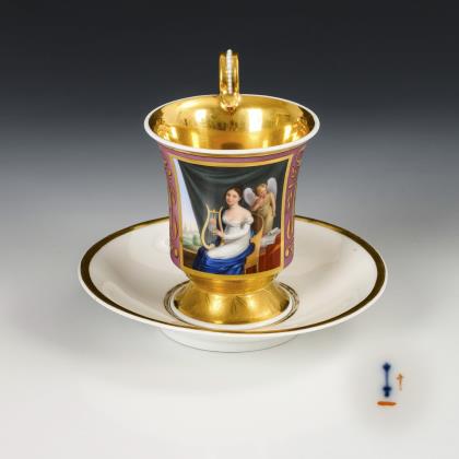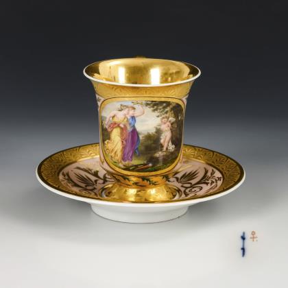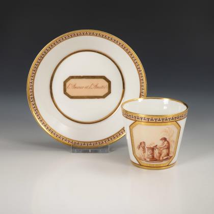 Modell "Konisch". Unter einer Bordüre eine goldgerahmte Rechteckkartusche mit der in Brauncamaieu gemalten Darstellung einer antiken jungen Frau, an einem Altar ein Opfer darbringend, ihr gegenüber ein Amorknabe mit Maske, im Spiegel der Untertasse die Aufschrift "L'Amour et l'Amitié."