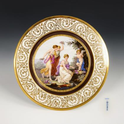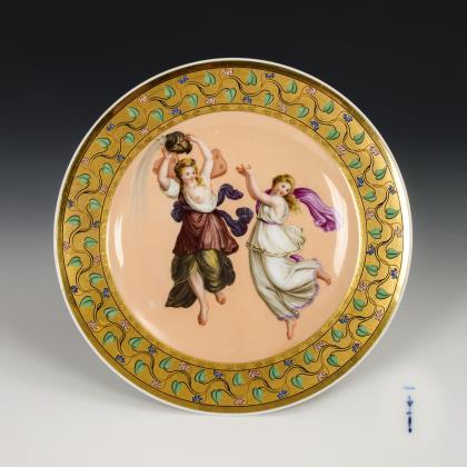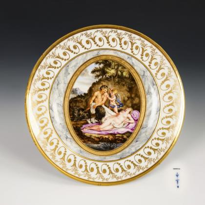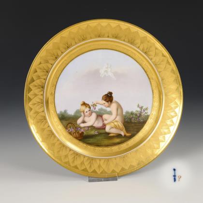 Teller mit floral goldradierter Fahne. Im Spiegel die allegorische Darstellung des Monats Mai: in einer Landschaft sitzendes Mädchenpaar an einem Blumenkorb, in den Wolken die grisaillegemalte Darstellung zweier Kinder für das Sternzeichen Zwilling