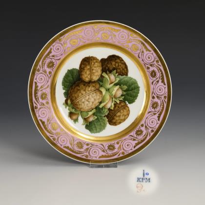Modell "Antikglatt" oder "Konisch". Rosafarbener Fahnenfond mit vegetabil-ornamentaler Goldmalerei. Im Spiegel ein Walnussbukett mit Haselnüssen