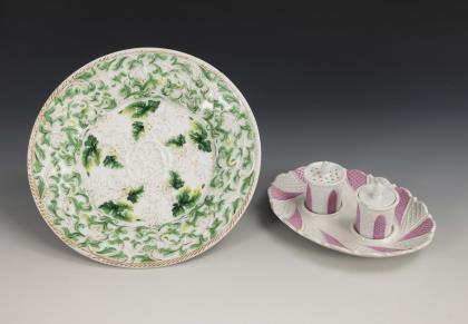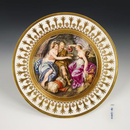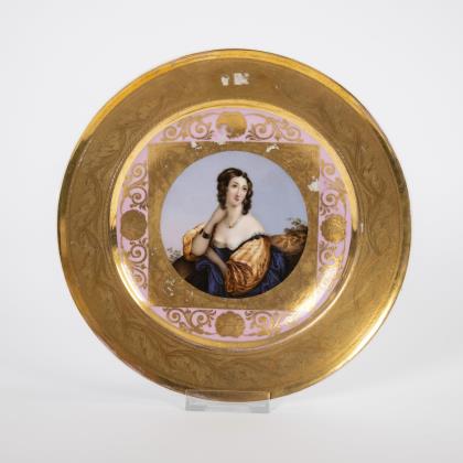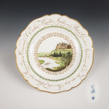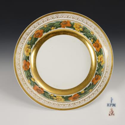 Mehrpassiger Teller mit polychromen Blumenfestons auf der türkisfarbenen Fahne, im Spiegel das bekrönte Spiegelmonogramm "WR" (= Wilhelmus Rex), wohl aus einem Service für König Wilhelm I.