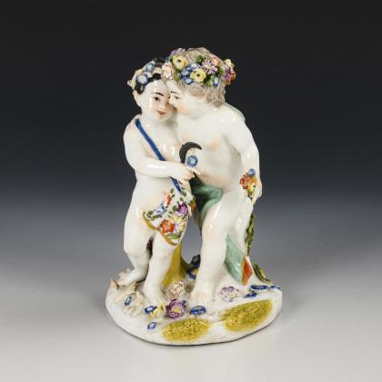 Auf einem blütenbelegten Sockel stehendes Puttenpaar als Allegorie des Frühlings und des Sommers