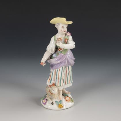 Auf einem blütenbelegten Sockel stehendes Mädchen, zu ihren Füßen ein Lamm mit Schleife liegend