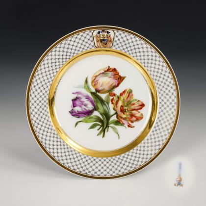 Teller "Glatt". Im Spiegel ein Blumenbukett mit Papageientulpen, auf der Fahne goldenes Netzmuster mit blauen Punkten sowie das pommersche Freiherren von Blixen-Finecke