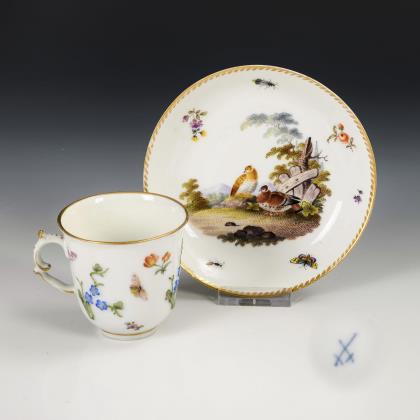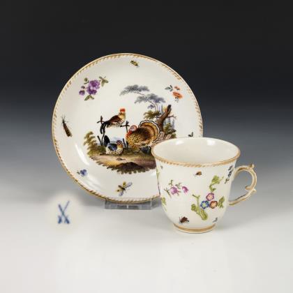 Glockentasse mit Rocaillehenkel und aufgelegten Blütenzweigen auf der Wandung. Auf der Tasse Streublümchen- und Insektenmalerei, im Spiegel der Untertasse Geflügelmalerei