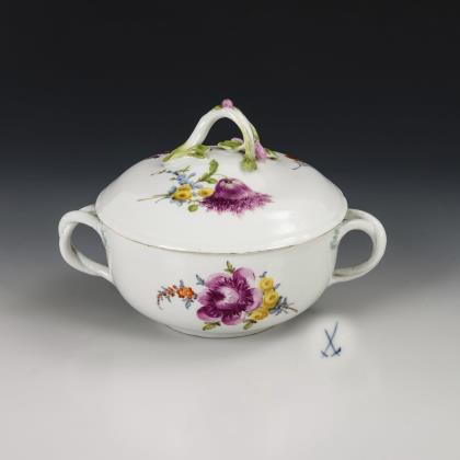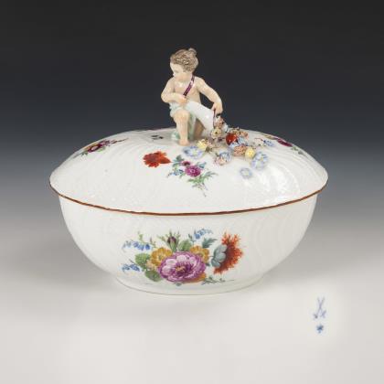 Form "Neuozier". Kleine, ovale Terrine mit Blumenmalerei und der Figur eines Putto mit Füllhorn auf dem Deckel