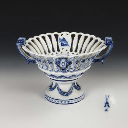 Gefußte Glockentasse mit Perlbandhenkel. Schauseitig die Darstellung eines Blumenkorbes vor Vermiculé-Goldfond, verso mattblauer Fond mit goldgravierten Blattvoluten, innen vergoldet