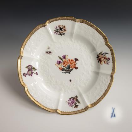 Barocker Teller mit Holzschnittblumen und Insekten. Meissen.