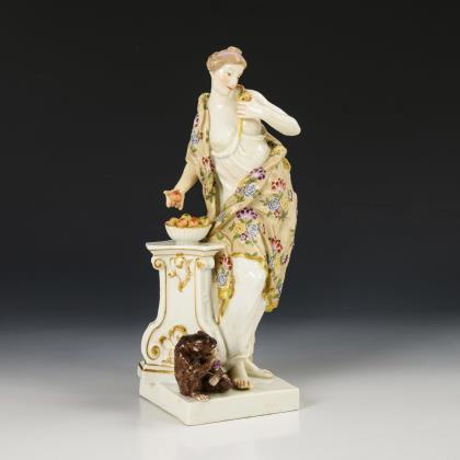 An einer Schale mit Früchten stehende junge, Früchte in den Händen haltende Frau, zu ihren Füßen ein eine Frucht essender Affe sitzend