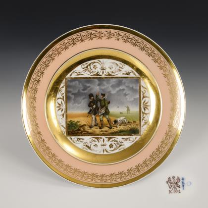 Im Spiegel eine goldgerahmte Rechteckkartusche mit der Darstellung von zwei Jägern im Regen mit Hund. Apricotfarbene Fahne mit vegetabiler Goldmalerei