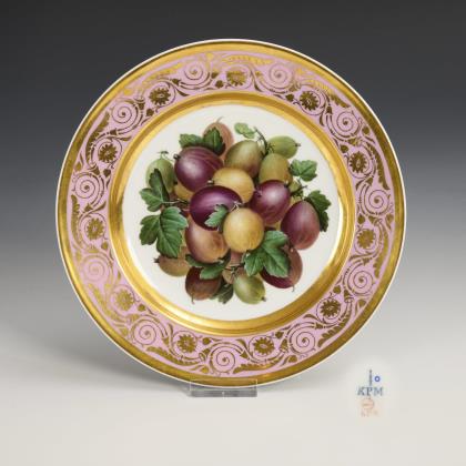 Modell "Antikglatt" oder "Konisch". Rosafarbener Fahnenfond mit vegetabil-ornamentaler Goldmalerei. Im Spiegel ein Fruchtbukett mit Stachelbeeren